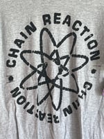 ASH GREY BLANK T-SHIRT WITH CHAIN REACTION PRINT ON FRONT// BLK INK // FRACTAL FLASH SLEEVE PRINT // GUARANTEED 100% WANNA BE FREE SMALL PRINT ON UPPER BACK // size: MEDIUM