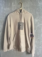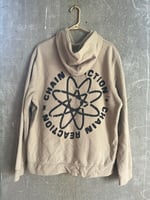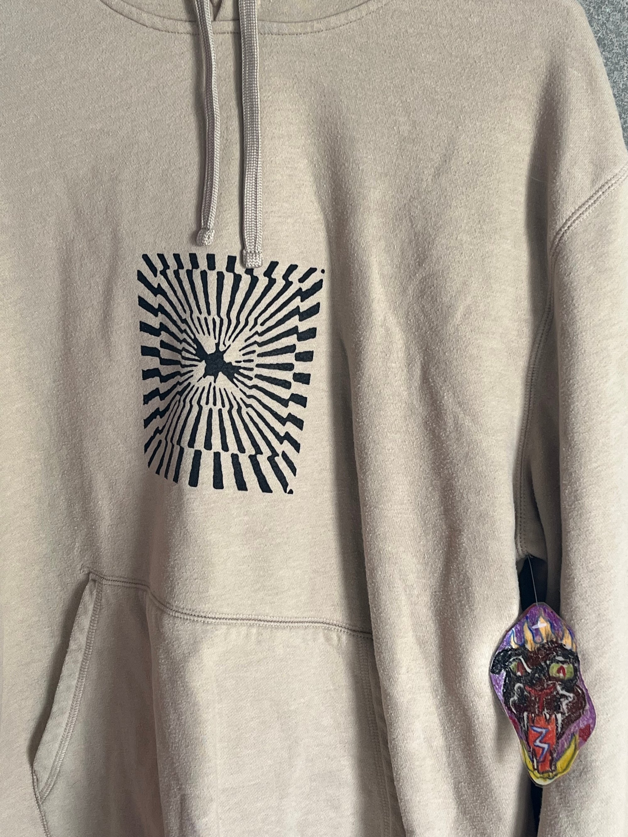 OFF WHITE///KHAKI//OATMEAL TEKGEAR HOODIE WITH FRACTAL FLASHFRONT PRINT/// CHAIN ++ REACTION printed on back and 100% wanna be free print on h00d///size::: XL