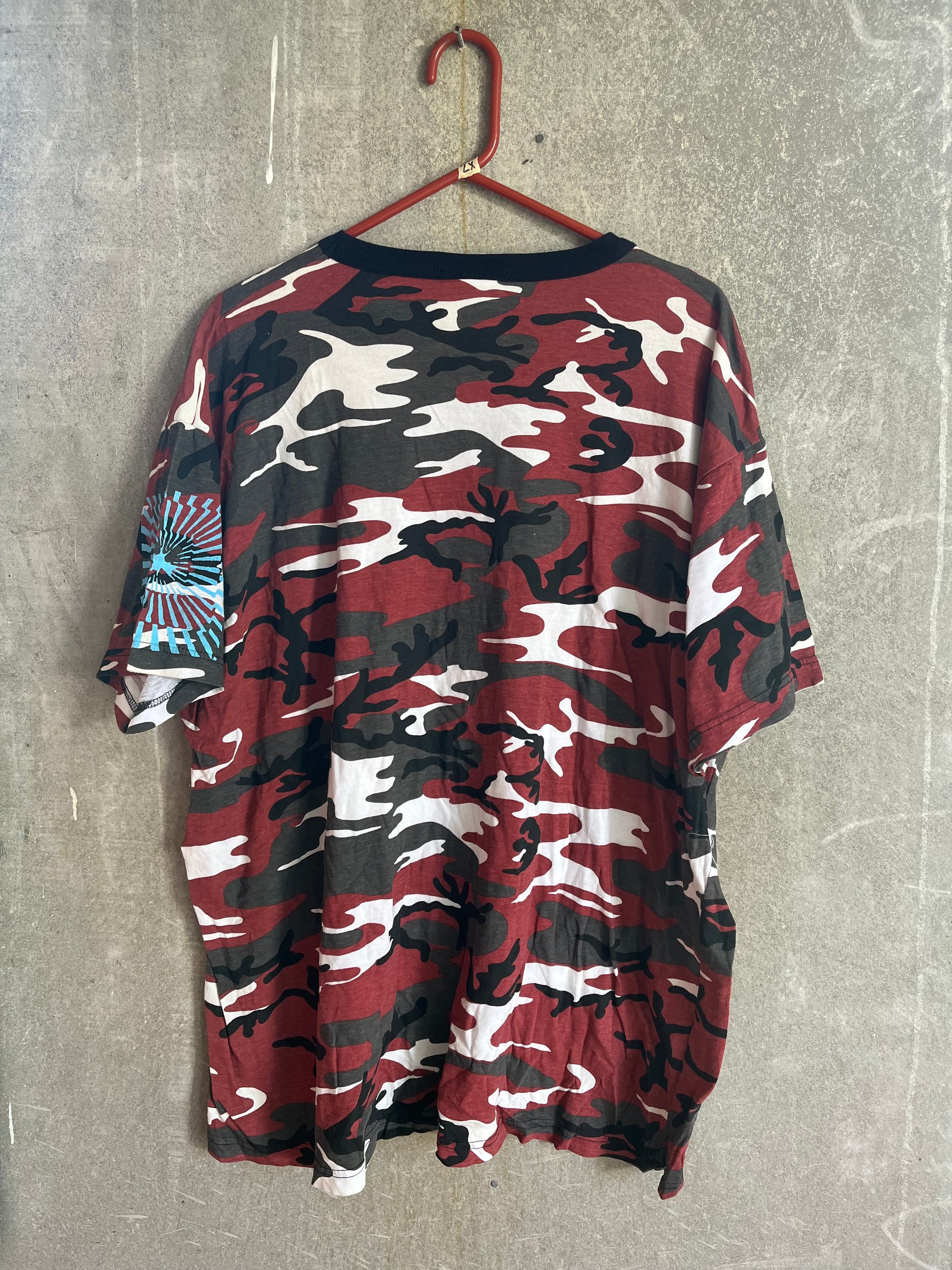 ROTHCO RED CAMO T-SHIRT WITH CHAIN REACTION PRINTED ON THE FRONT IN BABY BLUE INK/// FRACTAL FLASH SLEEVE PRINT /// size::: 2XL