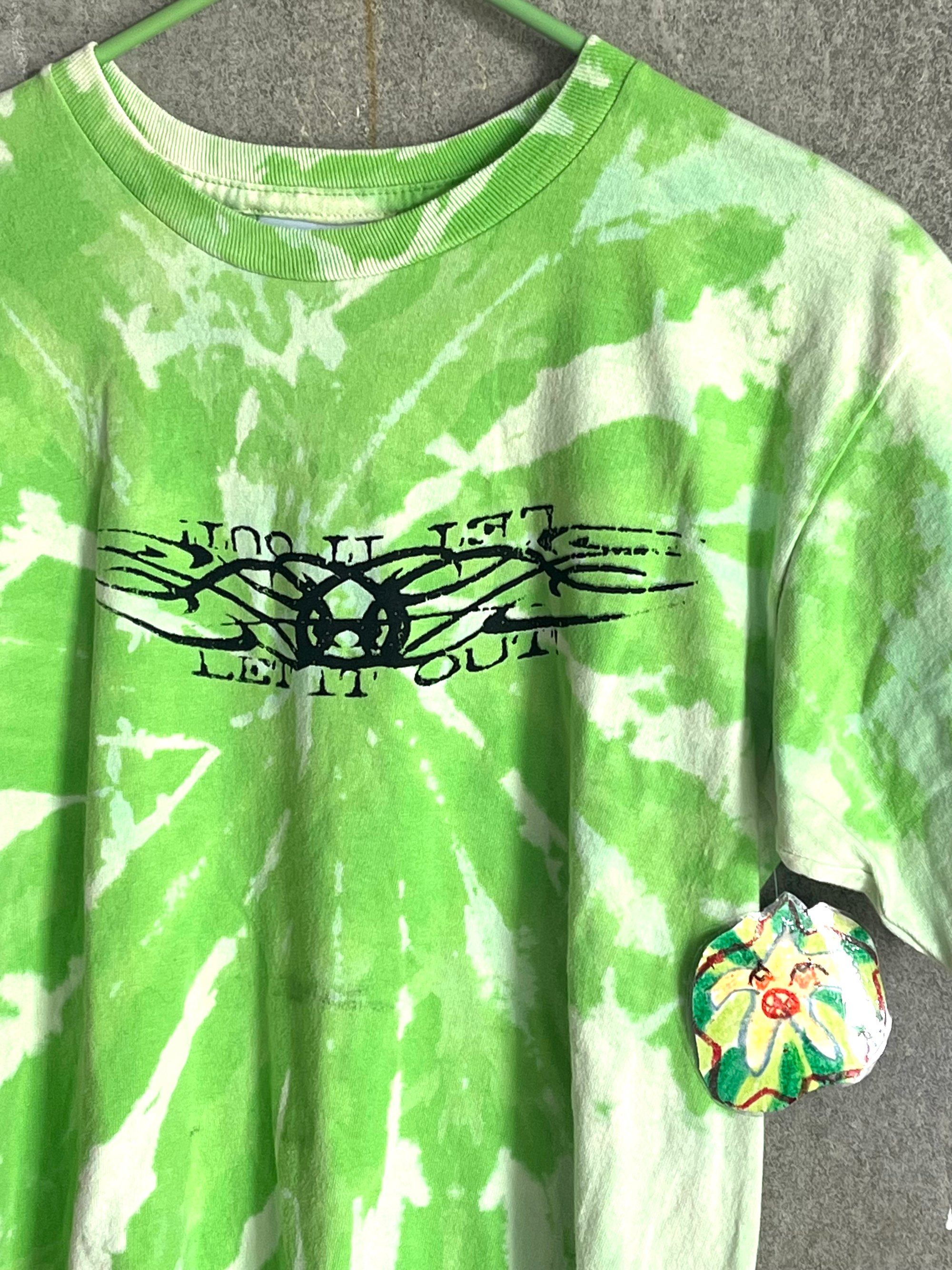 GREEN SMILE WITH WHITE STREAK TIE DYE WITH TRIBAL PRINT “let it out” GRAPHIC WITH BLACK INK ///SIZE::: SMALL ONE OFF TIE DYE