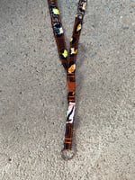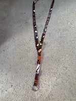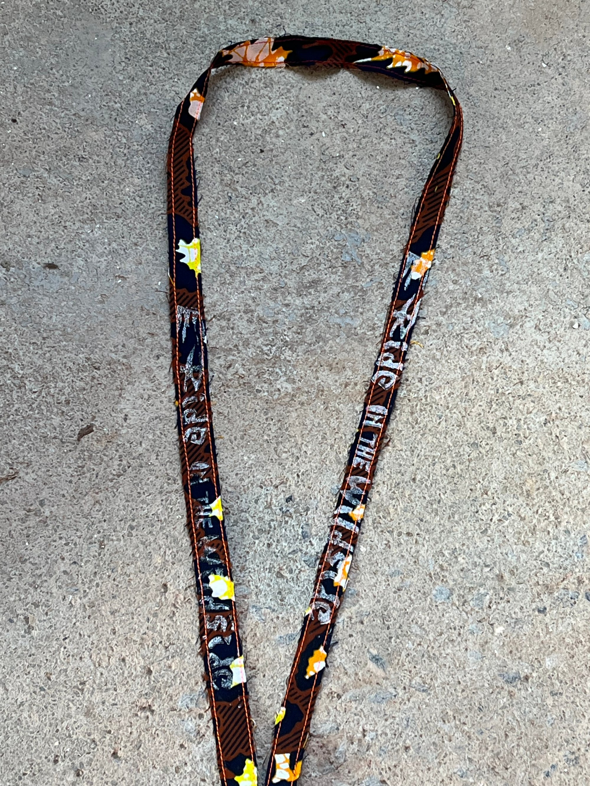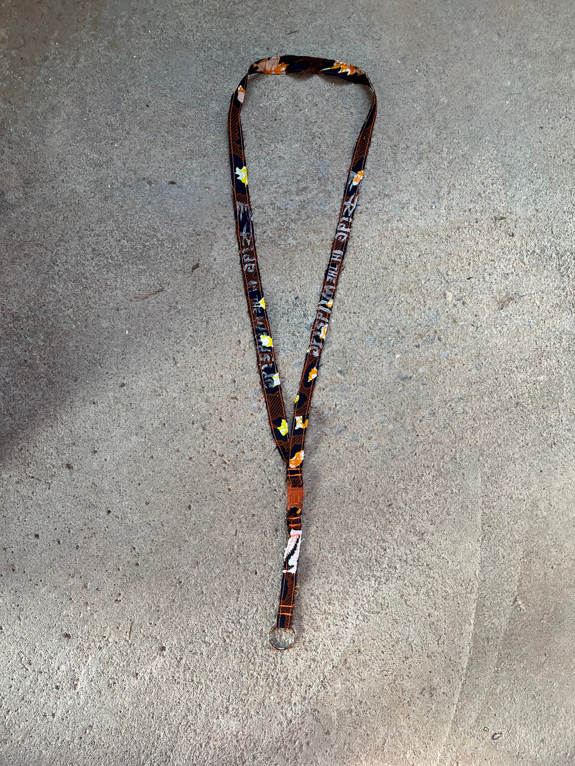 HAND SEWN BOOTLEG JUST DO IT// NIK3 NEON ORANGE AND YELLOW CHEETAH PRINT LANYARD WITH SMALL DETACHABLE PLASTIC ORANGE CLIP KEYCHAIN ++ PRINTED IN WHITE INK ++ ride on the wildside++